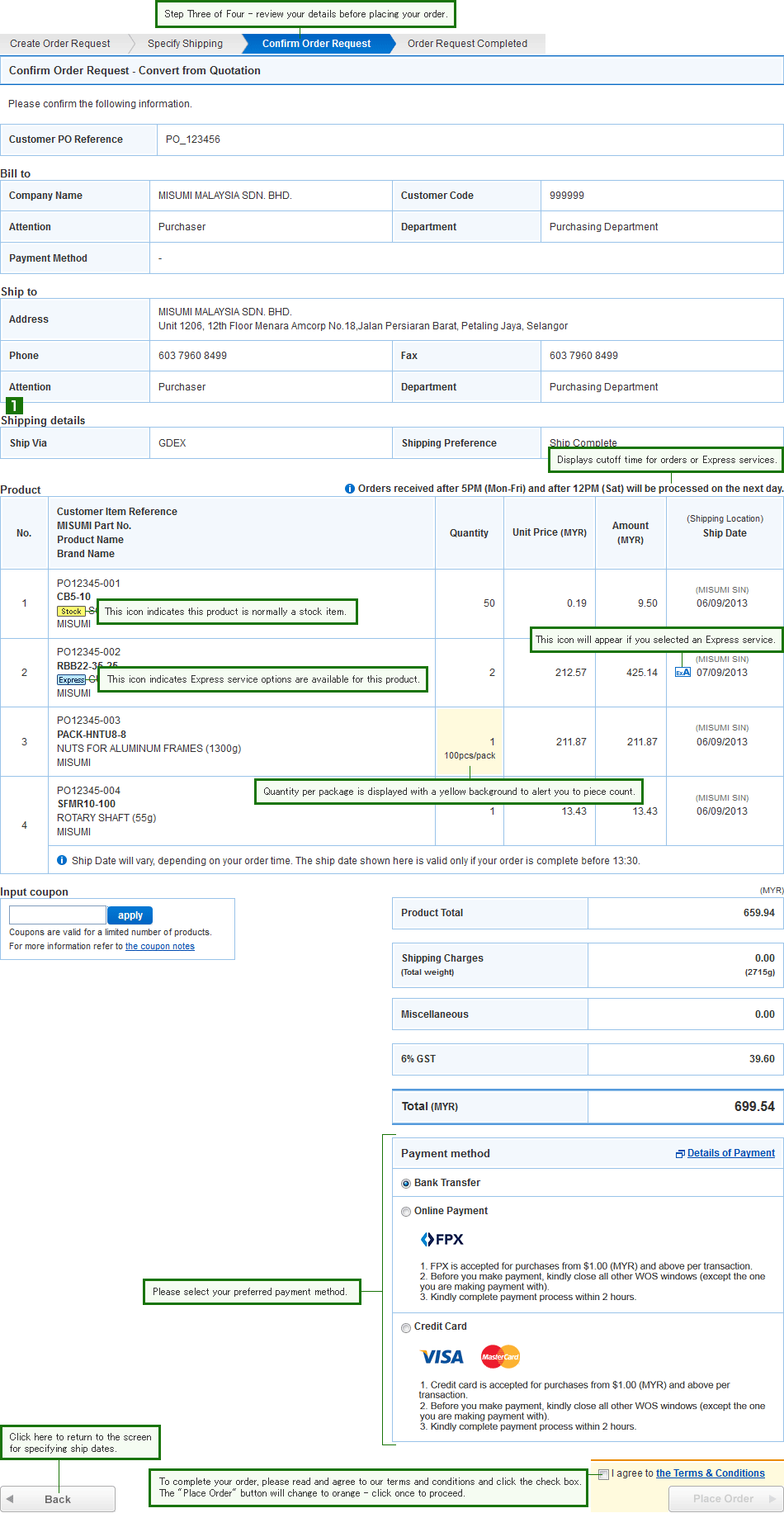 - Please review your shipping preference (Ship Complete, Ship Partially or Specify Ship Dates), shipment carrier and payment methods here.